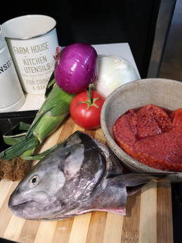 Start with a large cooking pot, fill with water add fish head, bring to a boil for 1.5 hours or until the head has fallen apart. Strain and add back to pot.